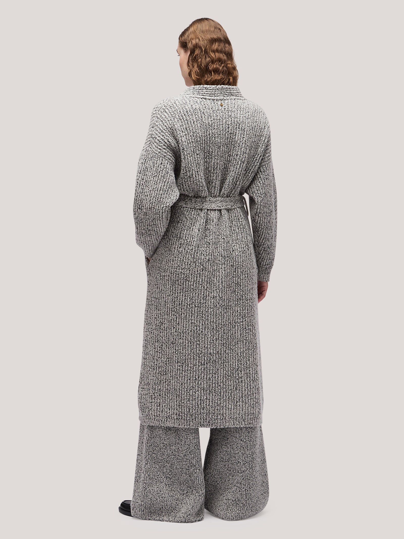Women's long open cardigan sweater, belt, two-tone English rib