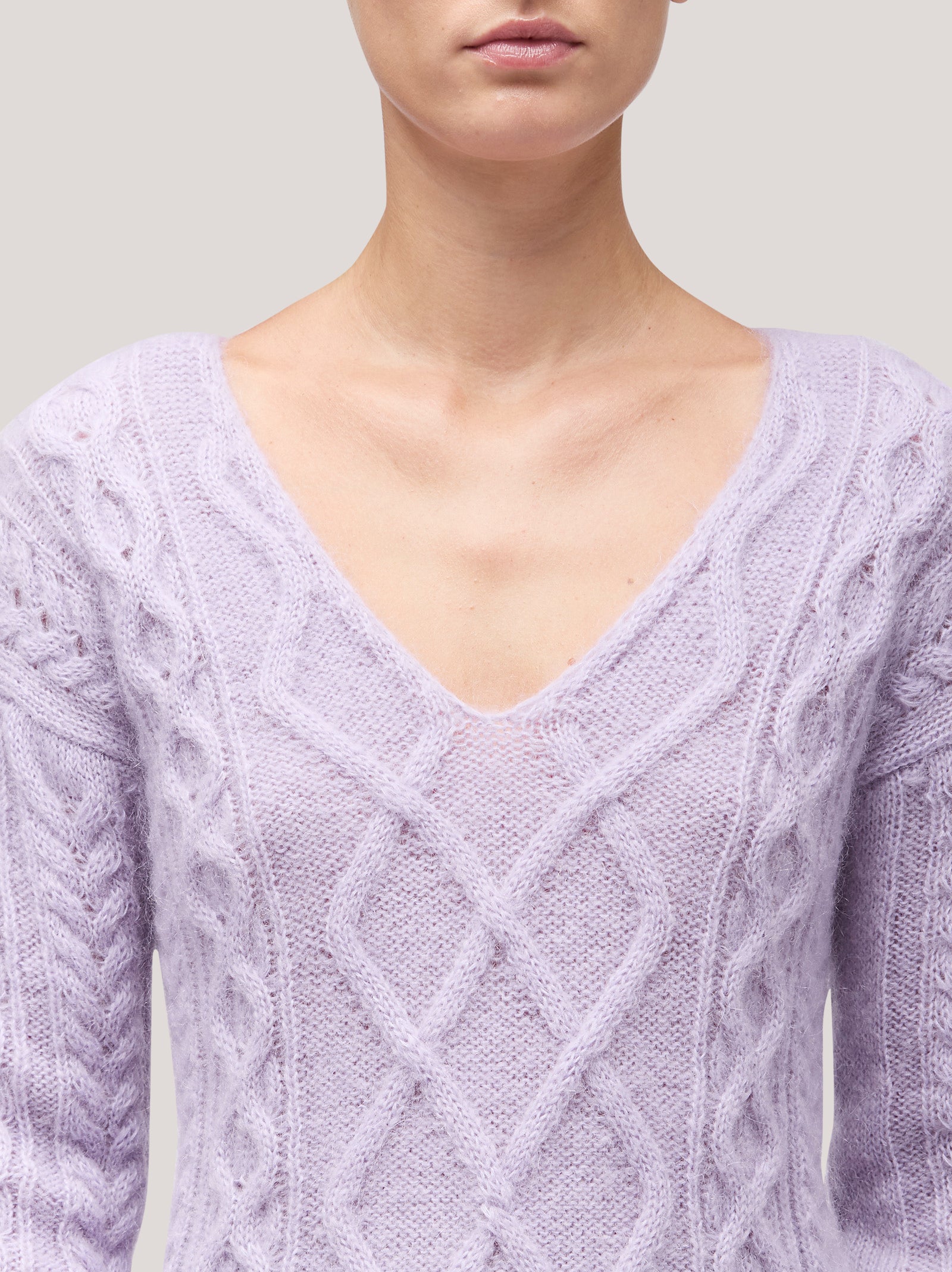 Women's V-neck cable knit sweater with long sleeves, soft mohair
