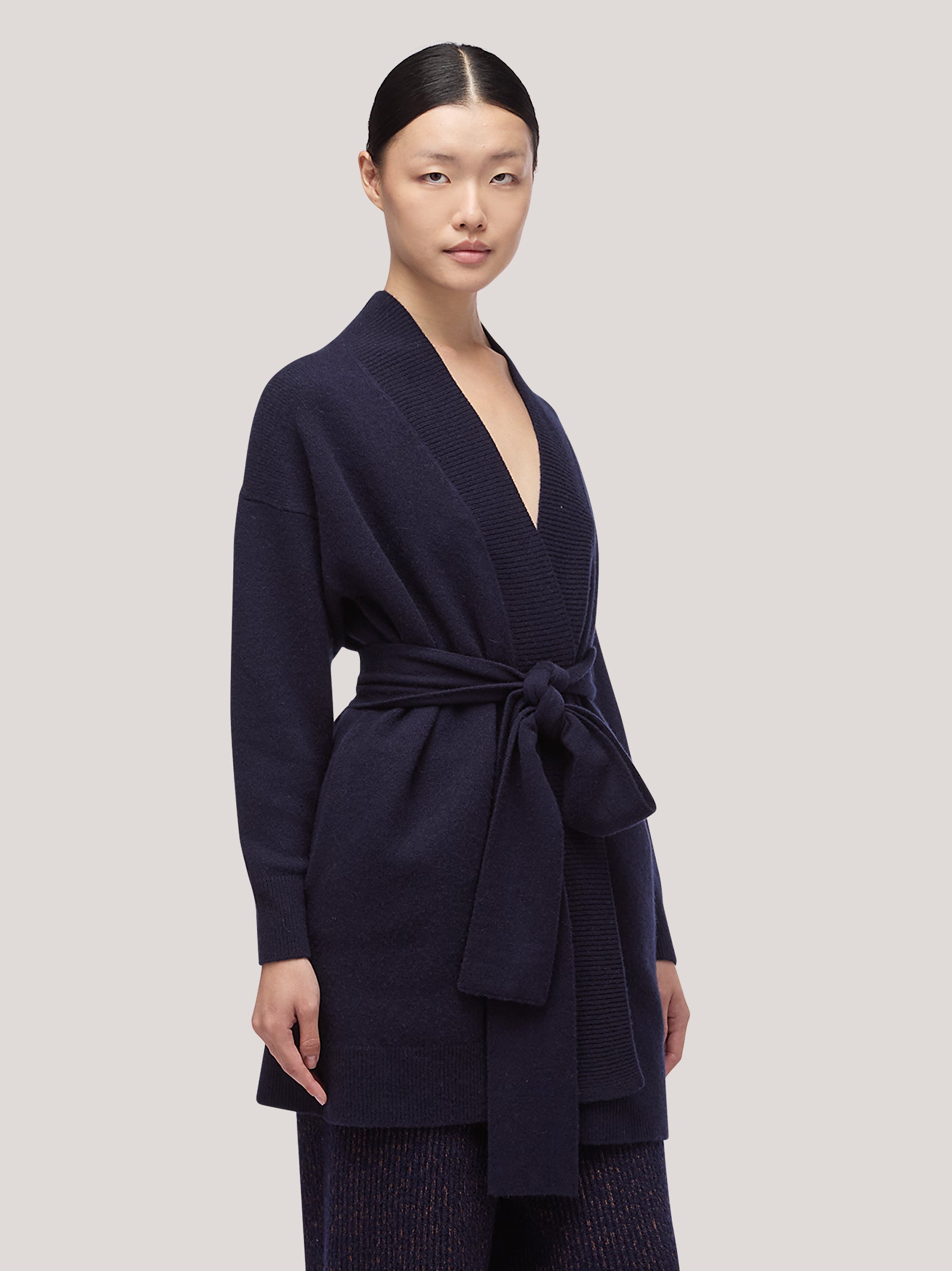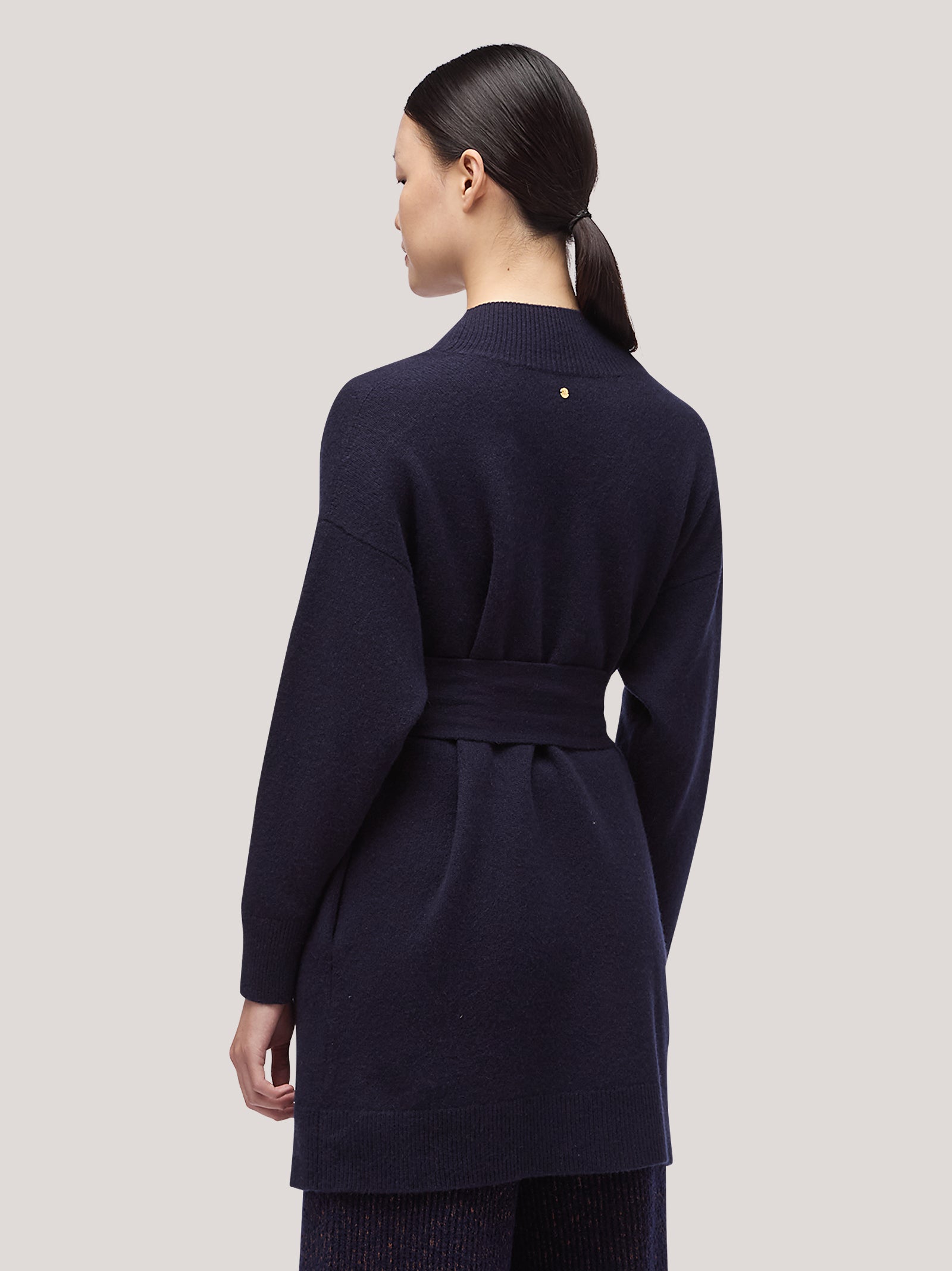Maglia cardigan donna liste a costa, tasche e cintura, garzato