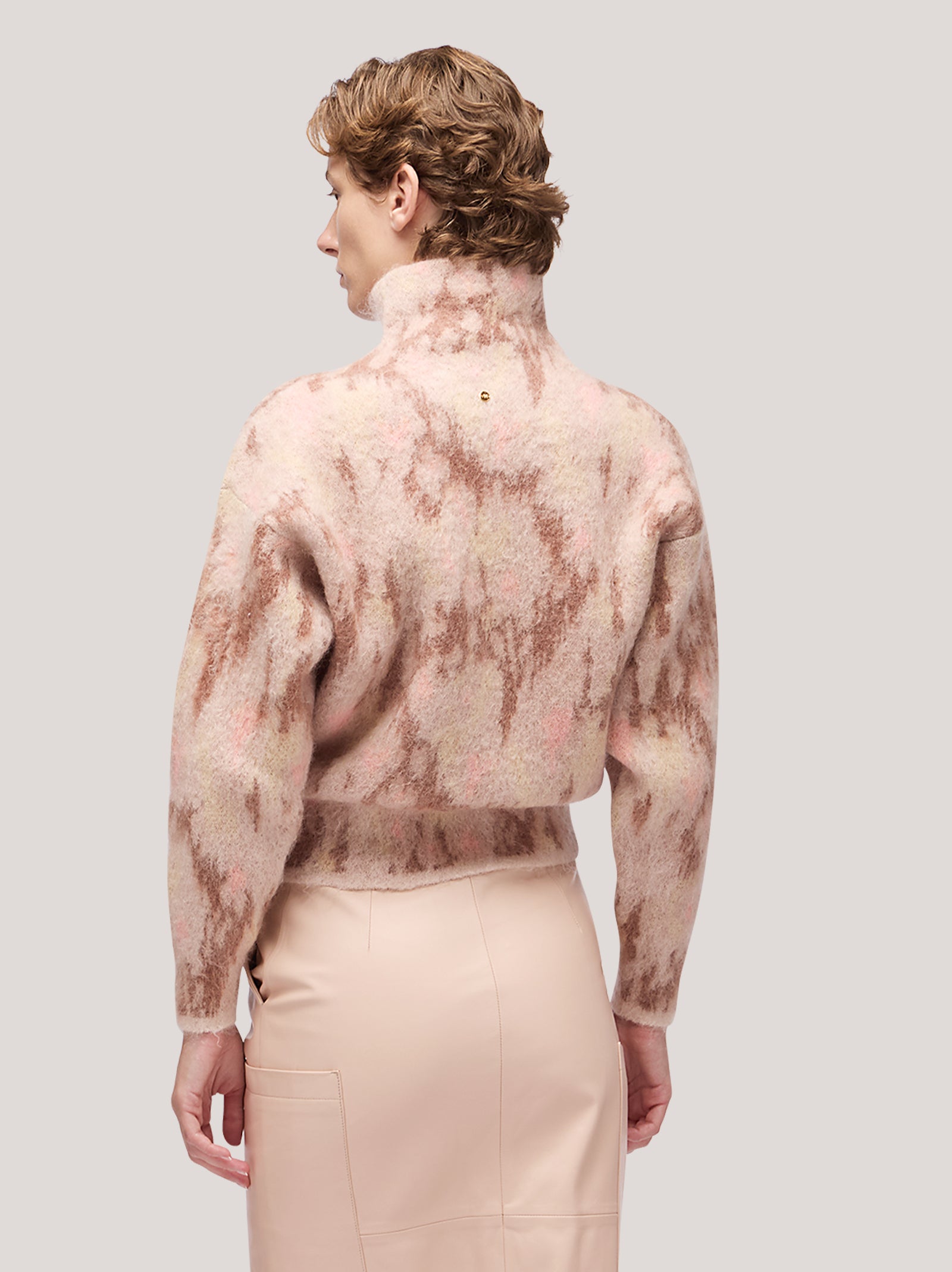 Maglia donna collo in piedi manica lunga, fantasia floreale pettinata