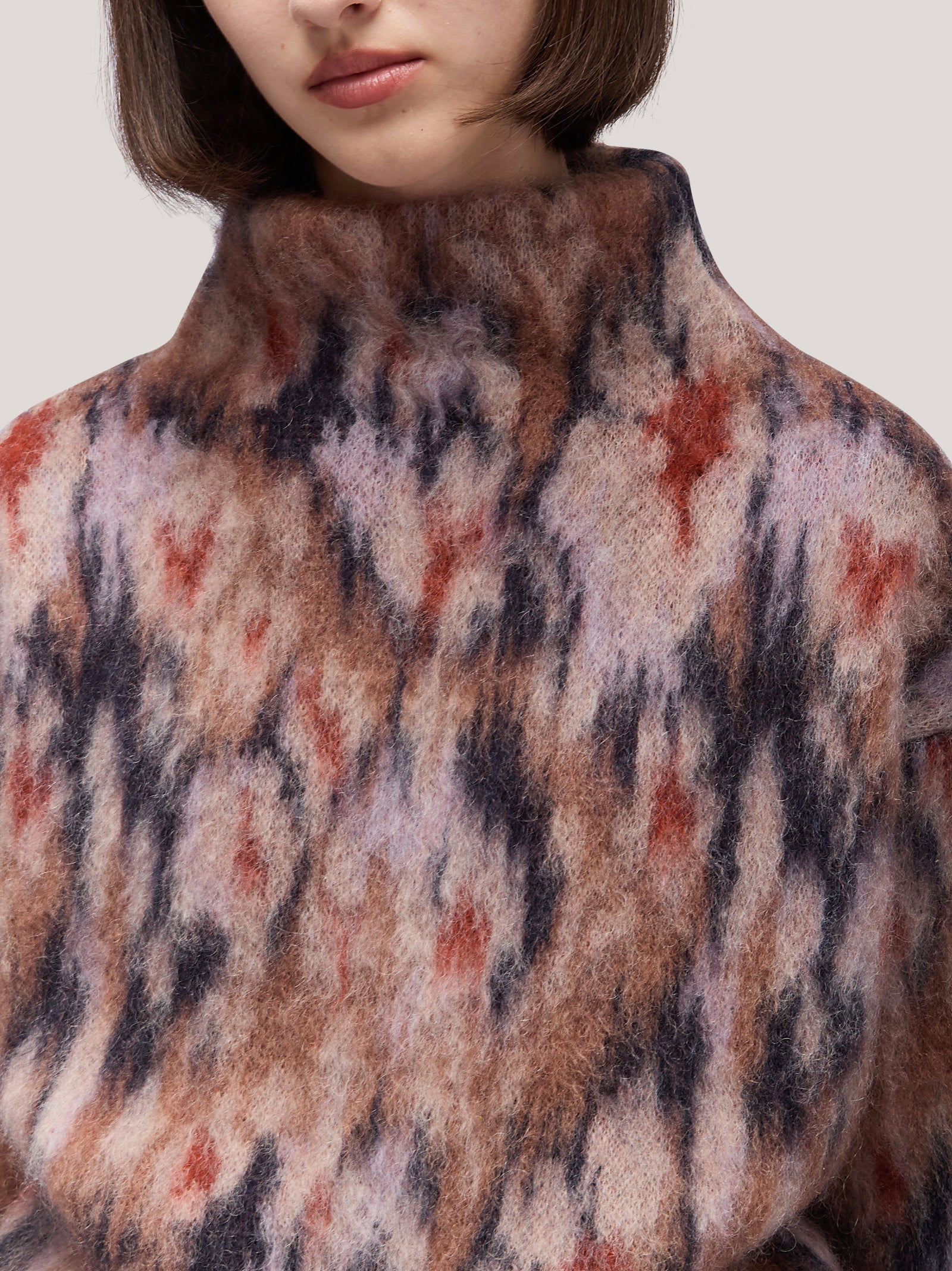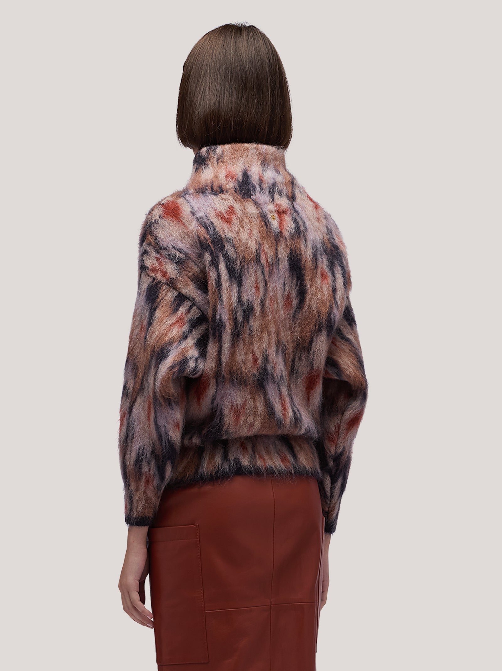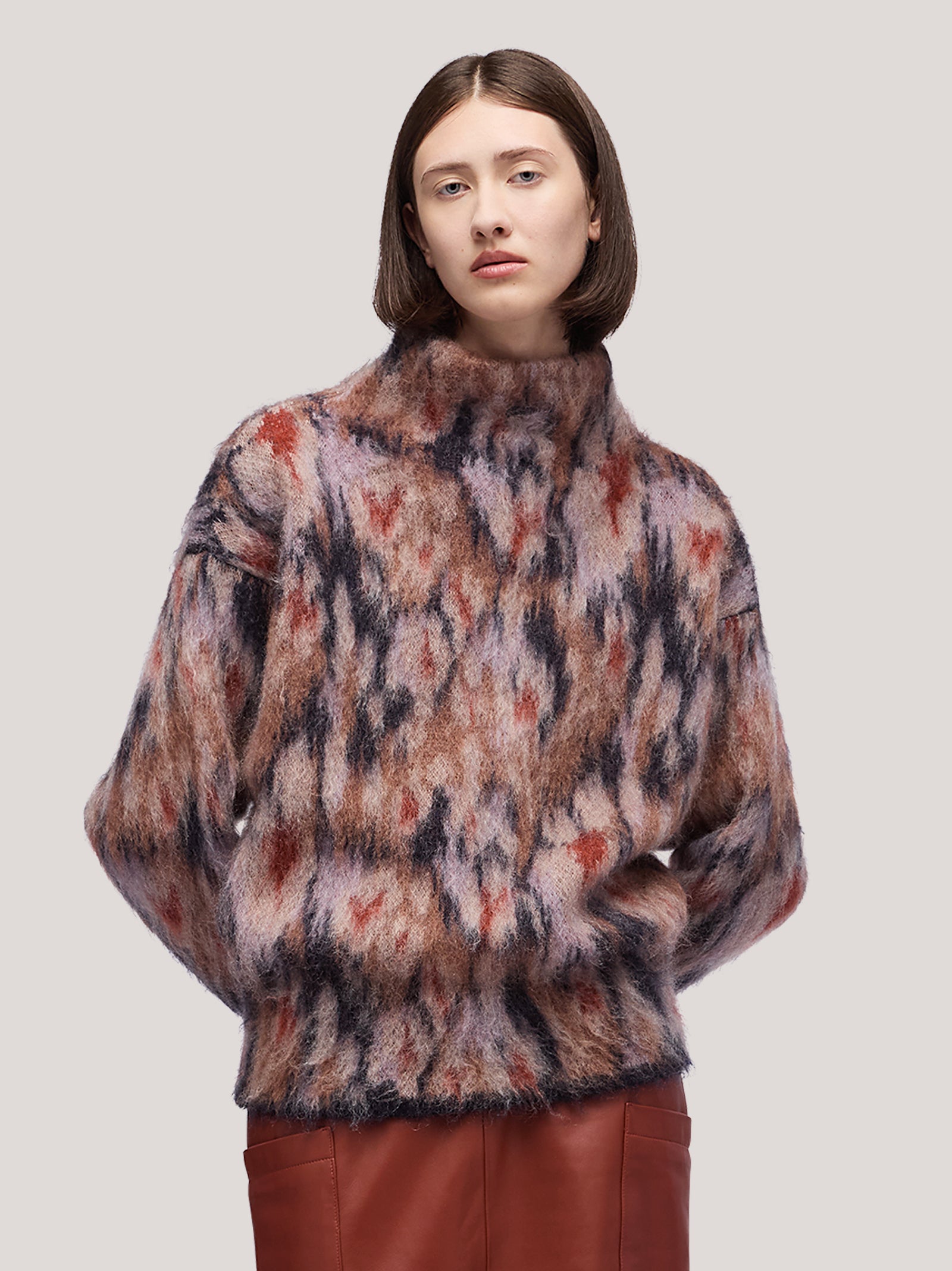 Maglia donna collo in piedi manica lunga, fantasia floreale pettinata